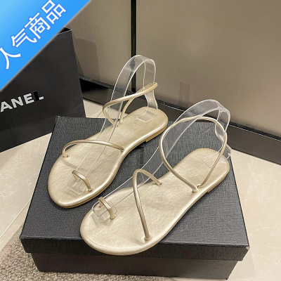 SUNTEK一字带夹脚凉鞋女款2023新款法式平底套趾罗马鞋配裙子百搭沙滩鞋