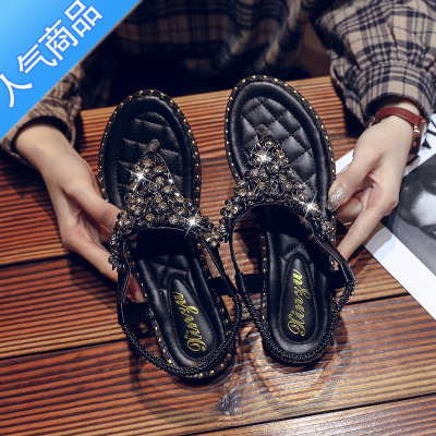 SUNTEK平底凉鞋女仙女风2023春季新款网红时尚夹趾水钻罗马沙滩鞋ins潮
