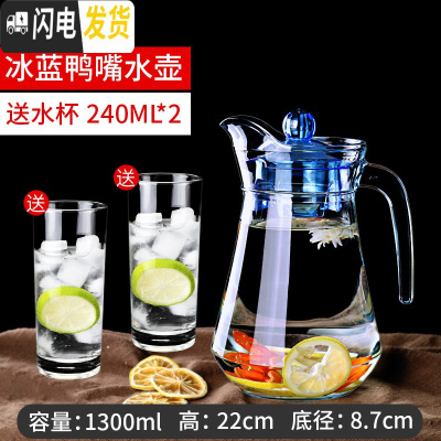 三维工匠水壶家用冷水壶玻璃大容量耐热凉水杯可高温果汁壶套装防爆 1壶2杯---蓝色1300鸭嘴壶(送水杯2支)凉水壶