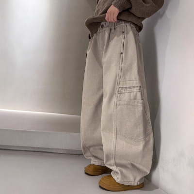 男童加绒裤子秋冬款男孩初中生12岁加厚牛仔裤男大童韩版阔腿裤潮