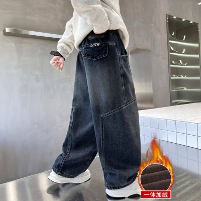 男童加绒裤子新款大儿童加厚长裤宽松秋冬一体绒直筒牛仔裤潮