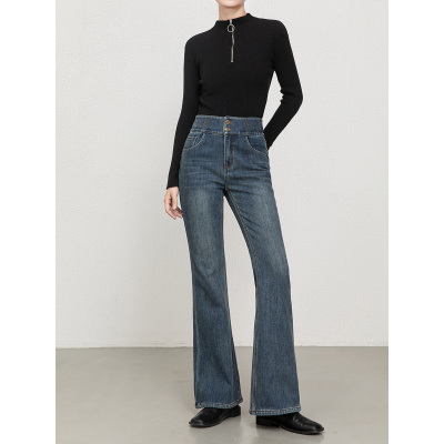 冬加绒加厚复古怀旧喇叭裤高腰刺绣微喇牛仔裤女
