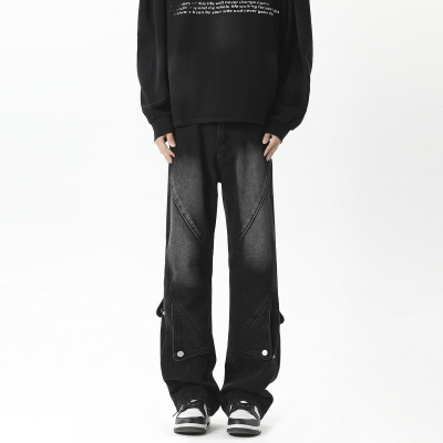 YANXU秋季黑色直筒宽松牛仔裤微喇裤子男生美式高街vibe风cleanfit