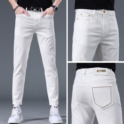 欧货牛仔裤男夏季薄款新款个性潮流弹力修身小脚白色九分裤