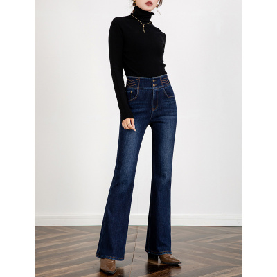 刺绣微喇牛仔裤女冬季复合绒高腰弹力显瘦加长拖地喇叭裤