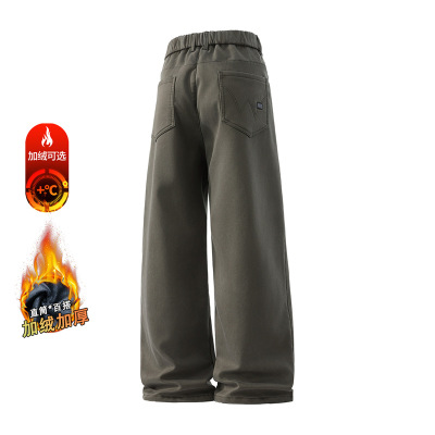 潮牌美式休闲裤男士冬季阔腿黑色水洗宽松直筒加绒裤子长裤秋冬款