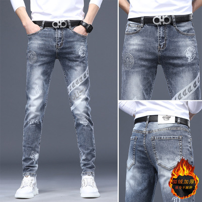 轻奢男士牛仔裤新款秋冬季加绒弹力烫钻印花修身小直筒休闲裤