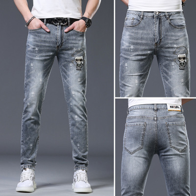 高端欧货牛仔裤男士潮牌夏季薄款百搭印花烫钻修身小脚休闲裤子男