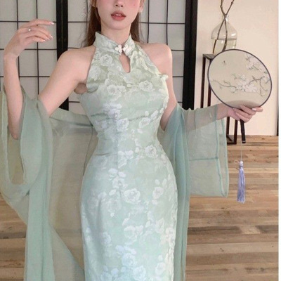 新中式国风清冷感绿色改良旗袍性感夏季新款女装挂脖连衣裙女