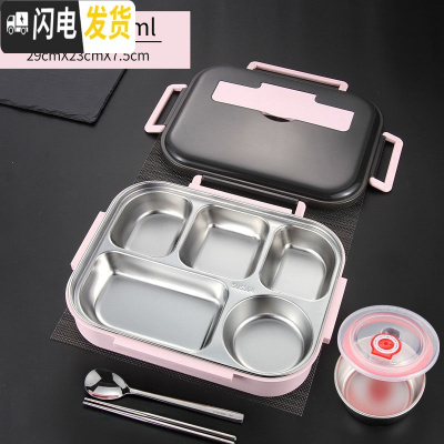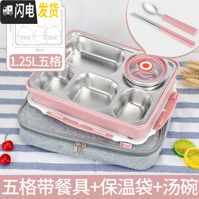 三维工匠饭盒分隔学生成人304不锈钢方形便当盒保温上班族便携打包带餐具 特深五格粉色带餐具+汤碗保温袋适合高中或成人