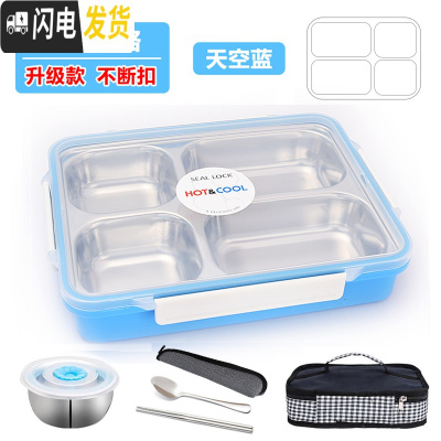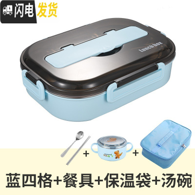 三维工匠SUS304不锈钢北欧多格饭盒一年级学校女生餐盒4/5分格日式便当盒 蓝四格(送勺筷)+汤碗+保温袋