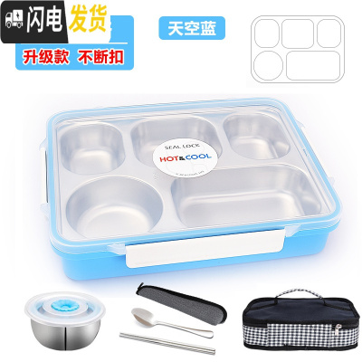 三维工匠SUS304不锈钢北欧多格饭盒一年级学校女生餐盒4/5分格日式便当盒 蓝五格(送勺筷)+汤碗+保温袋