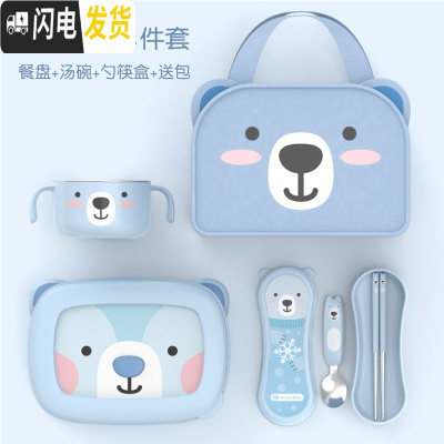 三维工匠韩国儿童保温分格便当盒小学生不锈钢餐盘可爱少女心餐具套装 蓝色小熊餐盘+汤碗+勺筷盒+包(送蓝色汤碗盖)