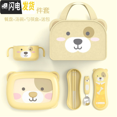 三维工匠韩国儿童保温分格便当盒小学生不锈钢餐盘可爱少女心餐具套装 黄色小狗餐盘+汤碗+勺筷盒+包(送黄色汤碗盖)