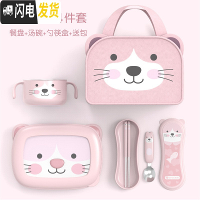 三维工匠韩国儿童保温分格便当盒小学生不锈钢餐盘可爱少女心餐具套装 粉色小猫餐盘+汤碗+勺筷盒+包(送粉色汤碗盖)