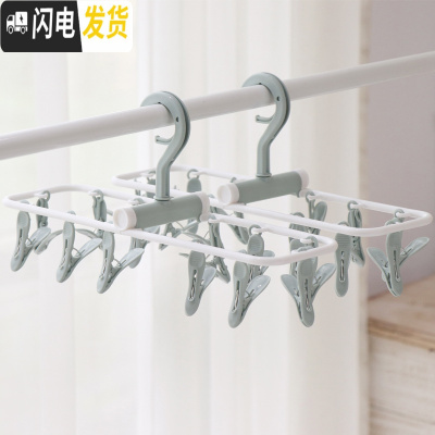 三维工匠2个装多功能12夹折叠塑料衣架 成人防风晾晒架儿童内裤袜子挂夹 [12夹]睿智蓝 2个