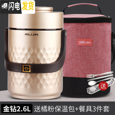 三维工匠304不锈钢超长真空保温桶饭盒学生上班族焖烧壶1人便携套装便当盒 金钻2.6+橘粉包(赠餐具)