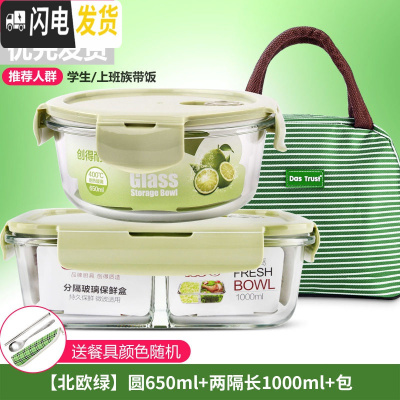 三维工匠微波炉饭盒套装学生分隔玻璃加热碗保鲜盒上班族保温便当餐盒日式 [北欧绿]圆650+两隔长1000+包+餐具
