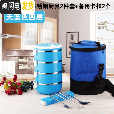 三维工匠上班族餐盒套装双层保温饭盒桶2三层学生不锈钢便当盒1人便携多层 4层天蓝色[送餐具+保温袋]