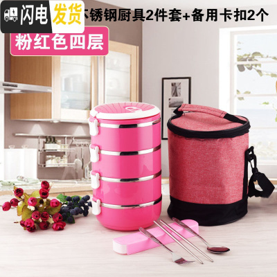 三维工匠上班族餐盒套装双层保温饭盒桶2三层学生不锈钢便当盒1人便携多层 4层粉红色[送餐具+保温袋]