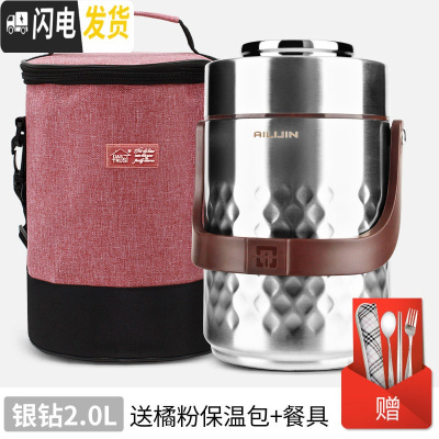 三维工匠304不锈钢超长真空保温桶饭盒学生上班族焖烧壶1人便携套装便当盒 银钻2.0+橘粉包(赠餐具)