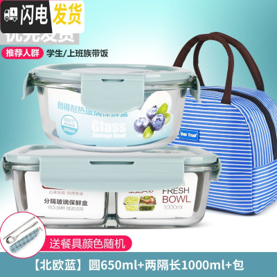 三维工匠微波炉饭盒套装学生分隔玻璃加热碗保鲜盒上班族保温便当餐盒日式 [北欧蓝]圆650+两隔长1000+包+餐具