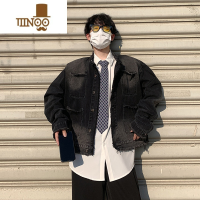YANXU短款牛仔外套男秋季潮牌痞帅感毛边水洗日系复古休闲工装夹克