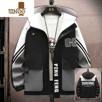YANXU连帽外套男潮牌撞色工装夹克男宽松休闲百搭青少年学生褂子