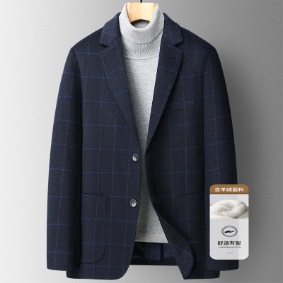 轻奢山羊绒西服男士秋冬季新款蓝格羊毛呢休闲单西装高品质男外套