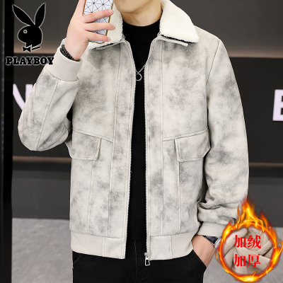 花花公子新款脏脏布 男士冬季加绒加厚外套时尚个性百搭夹克