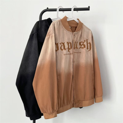 牛仔夹克男美式高街渐变情侣外套春秋宽松ins潮复古字母提花开衫