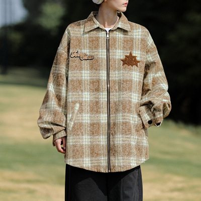 美式潮牌星星刺绣格子夹克衬衫男女同款春秋复古宽松情侣衬衣外套
