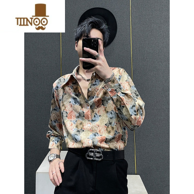 YANXU冰丝花衬衫男士ins设计感大领垫肩垂感长袖花玫瑰衬衣男百搭上衣