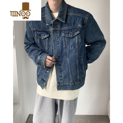 YANXU深蓝色垫肩短款牛仔外套男美式复古牛仔衣褂子cleanfit情侣装夹克