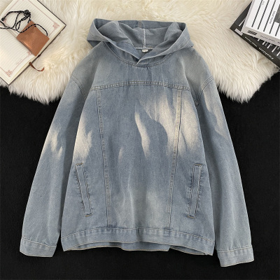 男装港洗复古牛仔卫衣男连帽春秋季新款潮牌日系宽松套头夹克