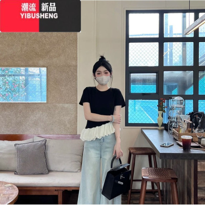 YIBUSHENG大码短袖T恤女季收腰显瘦黑色正肩上衣胖MM设计感下摆拼接体恤