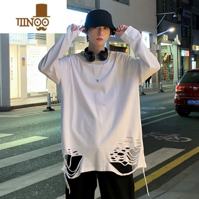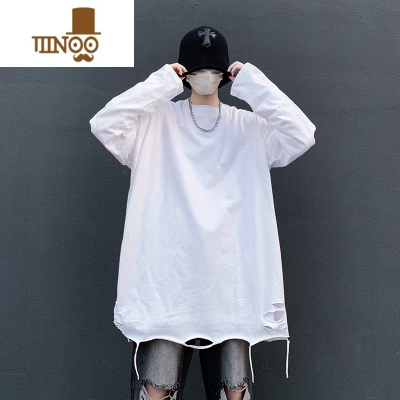 YANXU打底衫下摆破洞白色男生美式高街内搭潮破坏叠穿秋季卫衣长袖T恤