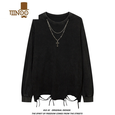 YANXU欧美高街水洗做旧下摆破洞潮牌卫衣设计感项链宽松内搭长袖T恤男