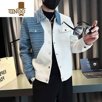 YANXU痞帅拼色牛仔外套男韩版修身上衣2023新款男士白色夹克