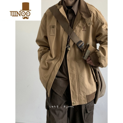 YANXU日系复古刺绣设计工装外套男女生情侣宽松翻领拼色夹克衫上衣