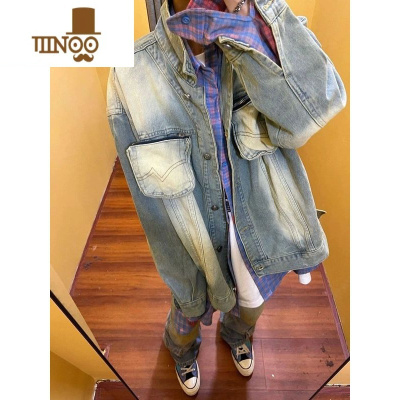 YANXU美式复古牛仔外套男新款水洗做旧潮牌宽松痞帅休闲夹克男士
