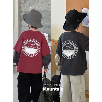 童酷男童秋季新款山系个性印花宝宝上衣拼色假两件儿童T恤潮