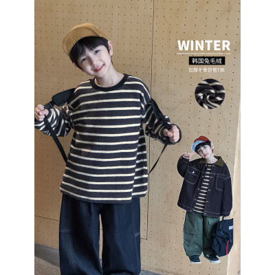 童酷男童冬季新款韩版条纹宝宝上衣兔毛绒柔软加厚儿童T恤潮