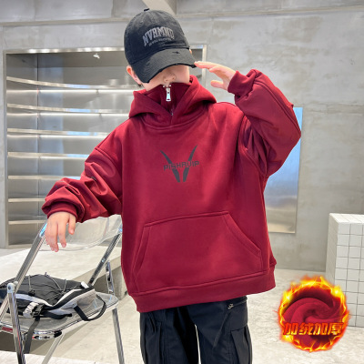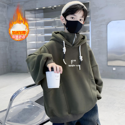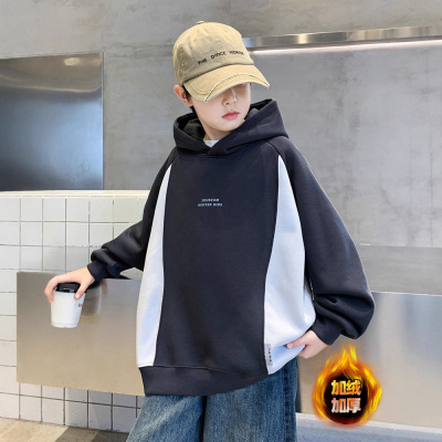 男童加绒卫衣秋冬新款中大童冬季打底衫痞帅儿童连帽上衣加厚
