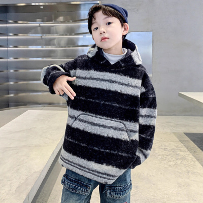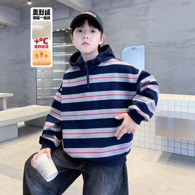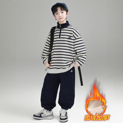 男童秋冬款卫衣加绒加厚新款儿童冬季一体绒大童冬装条纹上衣