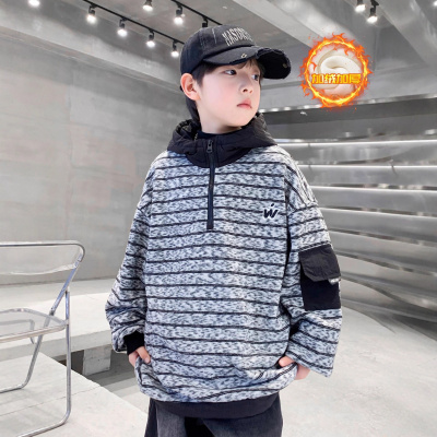 男童高领连帽卫衣加绒加厚新款中大童条纹上衣痞帅儿童秋冬装