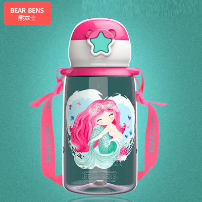熊本士学饮杯儿童水杯宝宝防摔幼儿园带盖吸管杯子大容量便携水壶【人鱼公主】