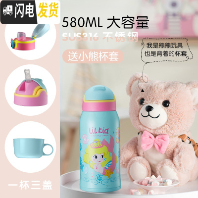 三维工匠儿童保温杯带吸管两用水壶小学生宝宝幼儿园316不锈钢水杯便携 人鱼公主