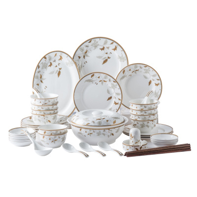 亿嘉IJARL 碗碟套装家用中式简约金边组合轻奢碗筷陶瓷餐具套装碗盘组合高档送礼 金枝玉叶系列 金枝玉叶56件套