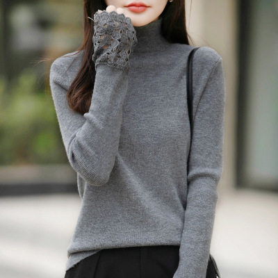 年秋冬新款安迪绒半高领针织衫长袖女袖口镂空钩花打底衫上衣